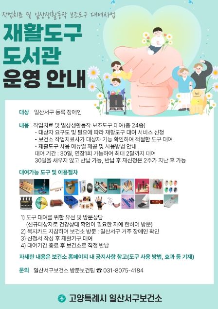 [제주교통복지신문 김강석 기자] 고양특례시 일산서구보건소가 일산서구 등록 장애인을 대상으로 ‘재활도구 도서관’ 사업을 운영한다. 의료기관 방문이 어려운 재가 장애인 등 관내 등록 장애인은 재활도구 도서관에서 작업치료 및 일상생활동작 보조도구를 대여할 수 있다.