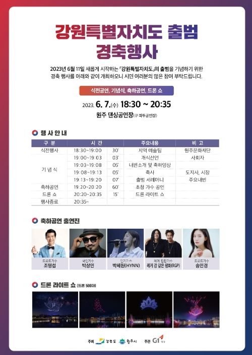 [제주교통복지신문 김강석 기자] 원주시는 강원도가 6월 11일 강원특별자치도로의 새로운 탄생을 시민과 함께 경축하고자 6월 7일 저녁 6시 반, 원주 댄싱공연장(구, 따뚜공연장)에서 '강원특별자치도 출범 경축행사'가 열린다고 밝혔다.