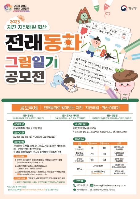 [제주교통복지신문 김강석 기자] 기상청은 6월 5일(월)부터 7월 17일(월)까지 미취학 아동 및 초등학생의 지진·지진해일·화산에 대한 이해와 공감을 확산하기 위해 '2023년 기상청 지진·지진해일·화산 전래동화 그림일기 공모전'을 개최한다. 이번 공모전은 온라인 지진과학관을 통해 접수할 수 있다.