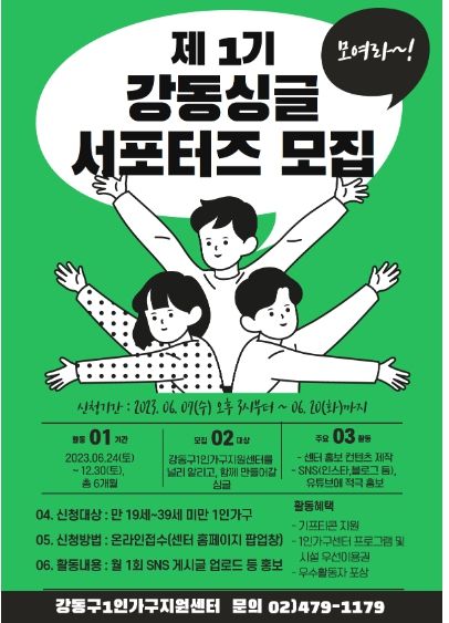 [제주교통복지신문 김강석 기자] 강동구는 1인가구의 정책수요를 반영하고 1인가구지원센터의 효율적인 운영을 위해 ’제1기 강동싱글 서포터즈‘를 모집한다고 밝혔다.
