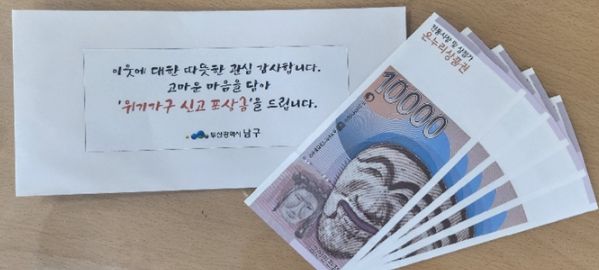 ‘위기가구 신고 포상금’은 복지 위기상황으로 지원이 필요한 가구를 발견해 신고한 사람에게 신고 1건당 5만원 상당의 온누리상품권을 지급하는 제도로, 남구는 지난 2월 '부산광역시 남구 위기가구 신고 포상금 지급 조례'를 제정하였으며, 부산 구·군 가운데 최초로 시행중이다.