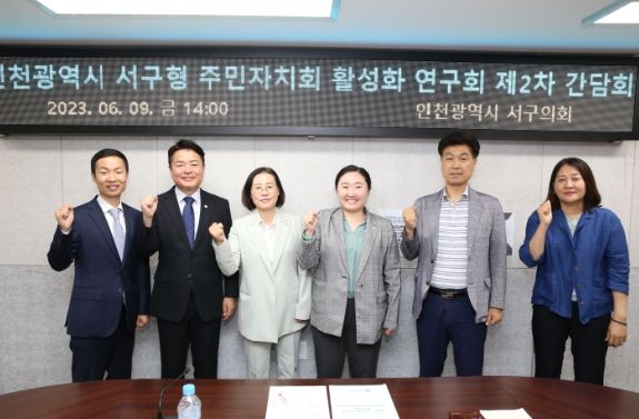 [제주교통복지신문 김강석 기자] 인천 서구의회 의원연구단체,'인천광역시 서구형 주민자치회 활성화 연구회'는 이달 9일 제2차 간담회를 개최하여 서구청 공동체협치과와 함께 행정안전부의 2023년 주민자치회 표준조례 개정 안내서와 선진기관 방문 계획 등에 대해 논의했다.