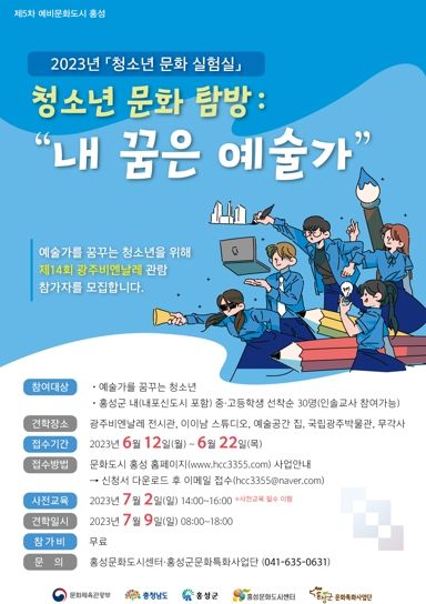 [제주교통복지신문 김강석 기자] 홍성문화도시센터는 청소년을 위한 문화실험실 사업의 일환으로 예술가를 꿈꾸는 청소년을 위해 광주비엔날레를 탐방하는‘내 꿈은 예술가’ 참가자를 오는 6월 22일까지 모집한다.