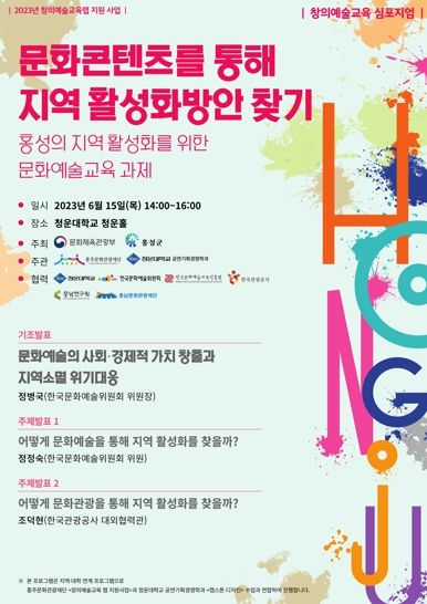 [제주교통복지신문 김강석 기자] 홍성군 홍주문화관광재단이 ‘문화콘텐츠를 통해 지역 활성화방안 찾기’를 주제로 오는 6월 15일 ‘창의예술교육 심포지엄’를 청운대학교 청운홀에서 개최한다고 밝혔다.