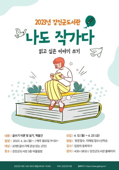 참여를 원하는 군민은 6월 23일까지 도서관에 방문하거나, 이메일로 신청서를 제출하면 되고, 자세한 사항은 강진군도서관으로 문의하면 된다.