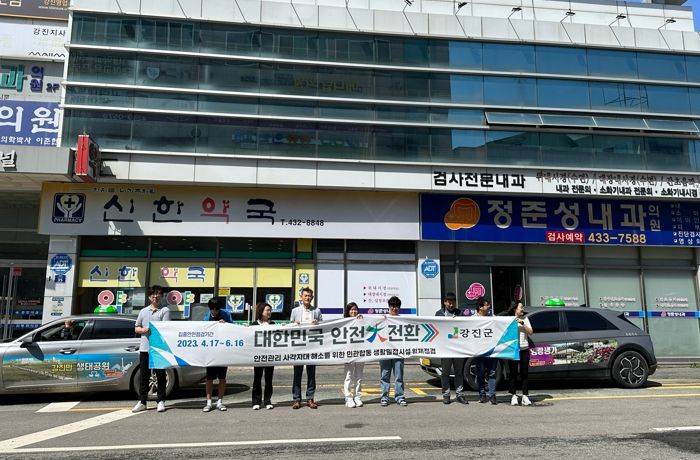 강진군 박상함 안전재난교통과장은 “이번 안전大전환 집중 안전점검을 통해 우리 군의 위험 요소를 사전에 발견하여 해소하는데 주력하겠다”며 “군민들께서 자율안전점검을 실시하고 안전신문고를 통해 주변 위험을 신고하는 등 적극 참여해 주시기 바란다”고 말했다.