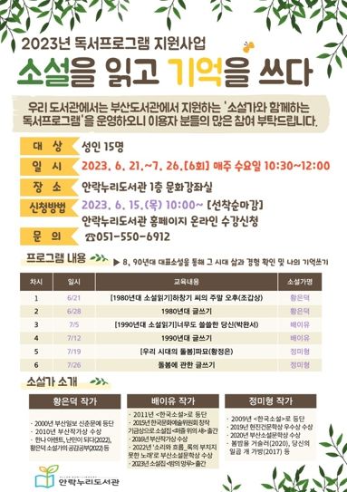 [제주교통복지신문 김강석 기자] 부산시 동래구는 오는 6월 21일부터 7월 26일까지 매주 수요일 오전 안락누리도서관에서 성인 15명을 대상으로 ‘2023년 독서프로그램, 소설을 읽고 기억을 쓰다’를 운영한다고 밝혔다.