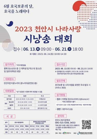 [제주교통복지신문 김강석 기자] 천안시가 주최하고 충청남도교육지원청이 후원하는 ‘나라사랑 시낭송 대회’가 6월 호국보훈의 달을 기념해 열린다.