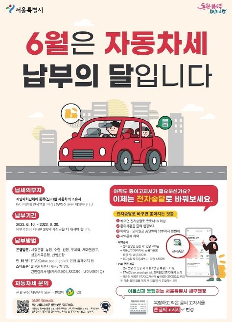 납부 기간은 오는 16일부터 30일까지이며, 금융기관에 직접 방문하거나 서울시 지방세 인터넷 납부시스템(ETAX), 서울시 세금납부 앱(STAX), 고지서 전용계좌, ARS 등을 통해 납부할 수 있다.