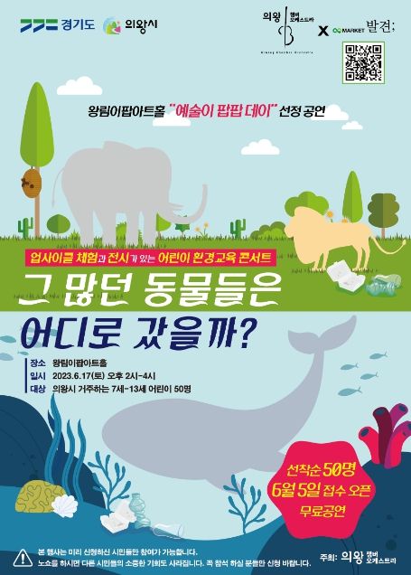 첫 프로그램인 의왕챔버오케스트라의 어린이 환경교육 콘서트 ‘그 많던 동물들은 어디로 갔을까? 는 6월 17일 토요일 오후 2시에 진행된다. 공연은 환경전문가 도슨트가 알려주는 멸종 동물 관련 전시 및 퍼포먼스로 시작해 쓰레기를 이용한 몬스터 에코백 만들기 체험, 오케스트라가 들려주는 동물과 자연 관련 클래식 음악 공연 등 다채로운 경험을 선사할 예정이다.