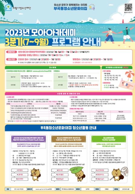 [제주교통복지신문 김강석 기자] (재)의왕시청소년재단 산하 부곡동청소년문화의집은 모아아카데미 3분기(7~9월) 수강생을 모집한다고 밝혔다.