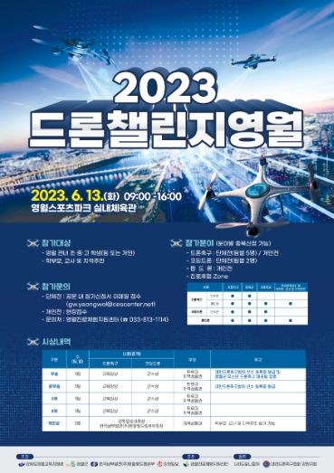 [제주교통복지신문 김강석 기자] 드론 실증도시인 영월에서 학생들의 진로교육을 지원하기 위해 지역 내 여러 기관이 협력하여 6월 13일 화요일 9시부터 오후 4시까지 영월스포츠파크 실내체육관에서 ‘2023 드론챌린지 영월’을 개최한다.