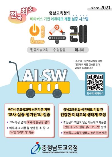 인수레는 ‘인공지능교육 수업활동 레시피’의 준말로, 2021년부터 충남교육청과 교육정보기술 기업 간 건강한 미래교육 생태계를 조성하고, 학교 내 원활한 인공지능교육을 위해 교육정보기술 제품 정보와 교육과정 연계 정보를 교실 안으로 제공하는 AI‧SW교육 교구 활용 지원 시스템이다.