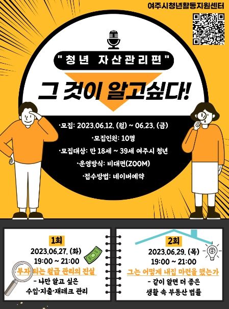 [제주교통복지신문 김강석 기자] 여주시 청년활동지원센터는 6월, 여주시 청년들을 위한 ‘그것이 알고 싶다, 청년자산관리’ 프로그램을 진행한다고 밝혔다.