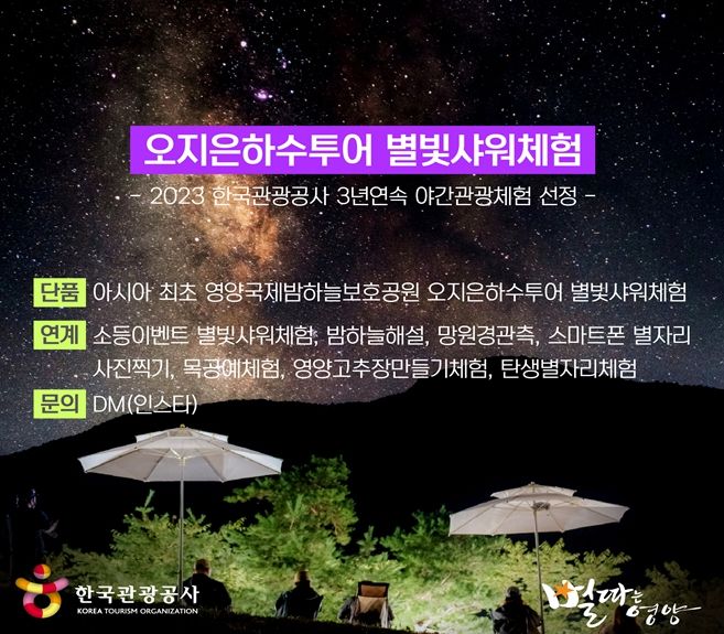 이 체험 프로그램은 2022년 ‘오지은하수투어 별빛샤워체험’으로 브랜딩하고, 5월부터 11월까지 매주 주말마다 상품 판매에 나서 지난 한 해 동안 6천500여 명이 영양 밤하늘의 별빛샤워체험을 하고 갔다.
