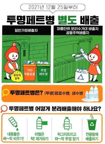 투명페트병은 ①내용물 비우기 ②부착상표(라벨) 제거하기 ③가능한 압착해 뚜껑 닫기 등을 거친 후 투명페트병 전용 용기 및 전용 수거대에 별도로 분리배출 한다.