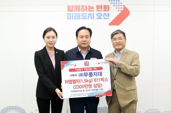 [제주교통복지신문 김강석 기자] 오산시는 지난 12일 ㈜무풍지대가 생계에 어려움을 겪는 이웃들에게 전달해달라며 2천300만 원 상당의 저염 멸치(1.5kg) 611박스를 기탁했다고 밝혔다.