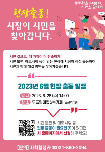 '현장 출동, 시장이 시민을 찾아갑니다'는 민선8기 시장 취임 후 시민 곁으로, 더 가까이, 더 진솔하게 시민과 소통하기 위해 추진하는 것으로 지금까지 총 106건의 민원을 접수하여 처리했다.