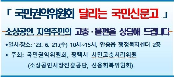 이번 ‘달리는 국민신문고’는 소상공인시장진흥공단과 신용회복위원회, 평택시 시민고충처리위원이 협업으로 참여하며,