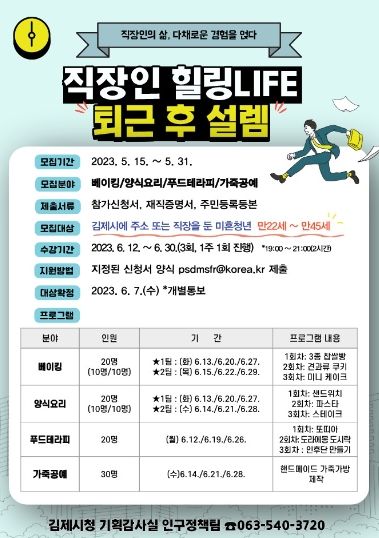 [제주교통복지신문 김강석 기자] 김제시는 지역 내 미혼 청년들이 자유롭게 소통하고 교류할 수 있는 취미클래스 직장인 힐링LIFE-퇴근 후 설렘 프로그램 운영을 6월 12일부터 6월 29일까지 3주간의 일정으로 본격 시행한다고 밝혔다.