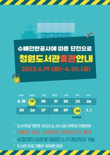 [제주교통복지신문 김강석 기자] 청주청원도서관은 수배전반 교체 공사에 따른 단전으로 오는 19일부터 6월 30일까지 휴관에 들어간다고 밝혔다.