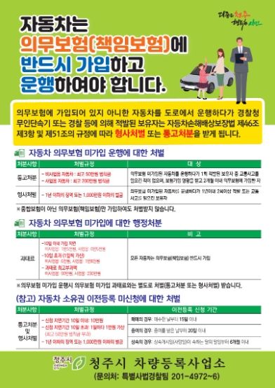 시는 자동차 의무보험 가입에 대한 중요성을 시민들에게 적극적으로 홍보하기 위해 의무보험 가입 홍보 안내문 10,000매를 제작해 시청, 구청 민원실, 읍·면·동 행정복지센터와 교통안전공단 및 운전면허시험장, 충청북도 교통연수원 등 자동차 관련 시민들이 많이 찾는 기관에 배부했다.