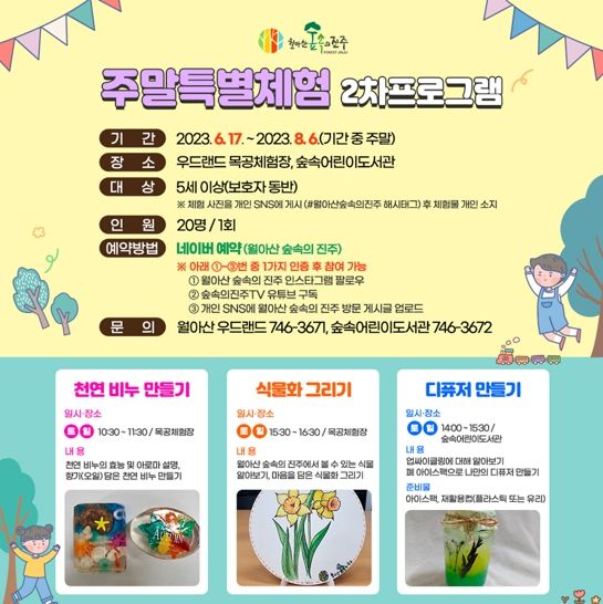 [제주교통복지신문 김강석 기자] 진주시는 ‘월아산 숲속의 진주’에서 지난 3월 1차 주말 특별체험 프로그램을 운영한 데 이어 6월 17일부터 특별체험 프로그램 2차 운영에 들어간다.