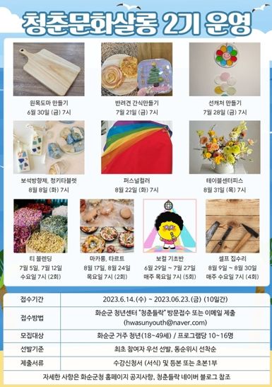 [제주교통복지신문 김강석 기자] 화순군은 청년의 능동적인 사회 참여 및 소통,교류의 기회를 제공하고, 창의적 활동을 장려하기 위한 ‘2023 화순군 청춘 문화 살롱’ 2기 수강생을 6월 14일부터 6월 23일까지 모집한다.