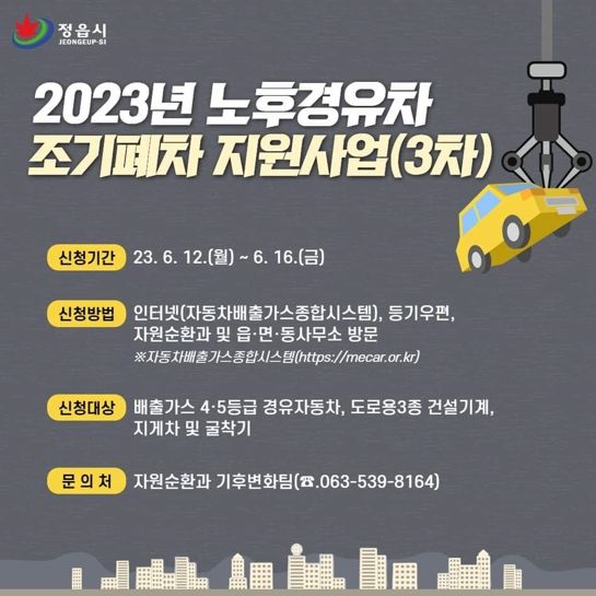 [제주교통복지신문 김강석 기자] 정읍시가 올해 세 번째 노후경유차 조기폐차 지원을 추진해 미세먼지 없는 쾌적한 도시조성에 나선다.