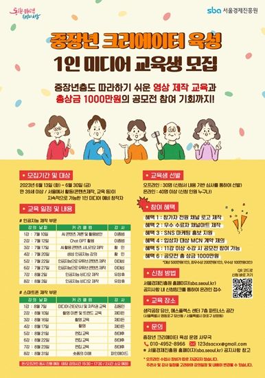 중·장년 크리에이터가 되길 희망하는 서울시민이라면 누구나 참여할 수 있다. 6월 13일부터 6월 30일 18시까지 SBA 누리집 ‘공지사항’ 게시글에서 ‘신청 바로가기’에 접속하여 지원서를 제출하면 된다.