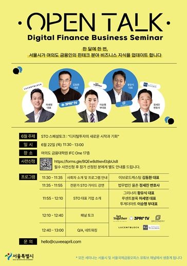 전문 변호사의 토큰증권발행(STO) 관련 현재 쟁점에 관해 강연을 듣고 기업의 STO 비즈니스 이야기를 공유한다. 대중적인 인플루언서의 진행으로 전문지식이 없어도 쉽게 이해할 수 있도록 이야기를 이끌어낼 예정이며, 해당 내용은 서울시 유튜브에 생중계된다.