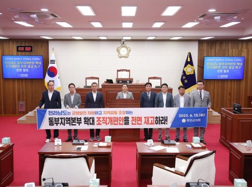 [제주교통복지신문 김강석 기자] 무안군의회는 13일 성명을 내고 전남라도가 추진 중인 ‘동부지역본부 확대를 위한 조직개편안’을 전면 재고할 것을 촉구했다.