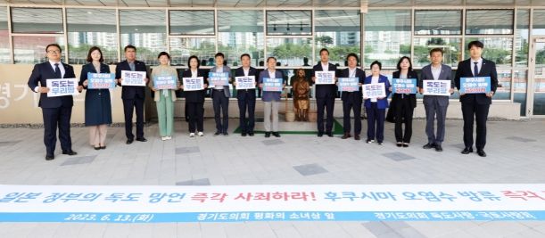 [제주교통복지신문 김강석 기자] 경기도의회 독도사랑·국토사랑회(회장 김용성 의원)는 13일 경기도의회 평화의 소녀상 앞에서 일본의 독도 망언 중단과 후쿠시마 원전 오염수 방류계획 철회를 요구하는 성명서를 발표했다.