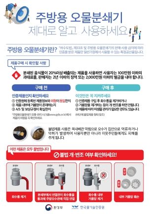 한편 주방용 오물분쇄기의 올바른 사용 방법은 음식물 찌꺼기 80% 이상은 회수통으로 받아 음식물 종량제 봉투로 배출하고 20% 미만의 음식물 찌꺼기만 하수로 배출하는 것이다. 또한 주방용 오물분쇄기는 '하수도법'제33조에 따라 환경부 장관의 승인을 받은 제품만 사용할 수 있다.