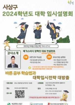 [제주교통복지신문 김강석 기자] 부산 사상구는 ‘바른 공부 학습법과 대학입시전략 대방출을 위한 2024학년도 입시설명회’를 6월 22일 오후 7시 부산도서관 모들락 극장(지하 1층)에서 개최한다.