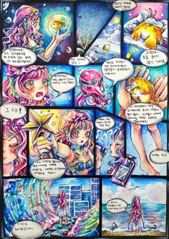 대현중 강수희 학생의 작품 제목은 ‘지구를 지켜요, 인어공주!’이다. 이 작품은 우리가 살고 있는 지구는 물이 71%를 차지할 만큼 중요하지만, 사람들이 버리는 쓰레기로 동물들이 아파하는 모습을 통해 환경의 심각성을 미리 깨닫고 동식물 모두가 깨끗한 환경에서 살면 좋겠다는 내용이 담겨 있다.