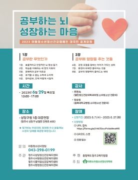 [제주교통복지신문 김강석 기자] 청주시 상당·서원·흥덕·청원정신건강복지센터는 오는 29일 상당구청 대공연장에서 아동·청소년 정신건강 캠페인의 일환으로 ‘공부하는 뇌, 성장하는 마음’이라는 주제로 대국민 공개강좌를 개최한다고 밝혔다.
