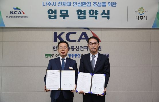 12일 나주시에 따르면 양 기관은 최근 KCA대회의실에서 강영구 부시장, 권영모 KCA전파관리실장 등이 참석한 가운데 ‘전자파 안심 환경 조성’을 위한 업무협약을 체결했다고 13일 밝혔다.