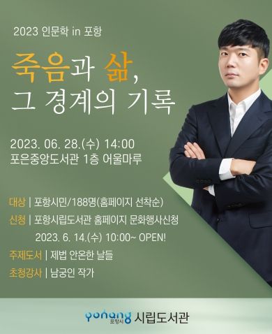[제주교통복지신문 김강석 기자] 포항시는 6월 문화가 있는 날을 맞아 남궁인 작가를 초청해 28일 오후 2시 포은중앙도서관에서 ‘인문학 in pohang-인문학에 입문하게’ 강연을 진행한다.