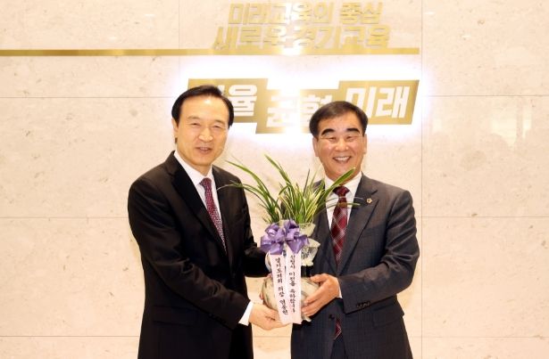 염 의장은 임 교육감에게 도교육청의 광교 청사이전 축하인사를 전하며, 1층 로비의 독서공간 등의 대민문화공간과 교육감 집무실 등 주요시설을 둘러봤다.