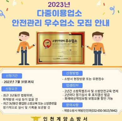 [제주교통복지신문 김강석 기자] 계양소방서는 2023년 7월 31일까지 다중이용업주의 자율안전관리 문화를 정착하고 사회적 안전 공감대 형성을 위해 다중이용업소 안전관리 우수업소를 모집한다고 밝혔다.