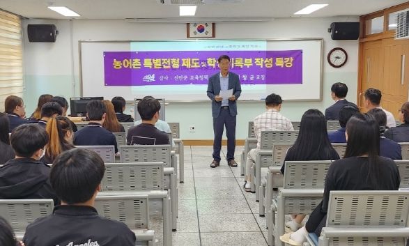 이창균 신안군 교육정책 특별보좌관은 지난 12일 임자고등학교에서 교사와 학생, 학부모를 대상으로 맞춤형 대입전형 학교생활기록부 작성 및 농어촌특별전형 제도를 강의하며 명문대에 진학할 수 있다는 ‘희망’을 공유했다.