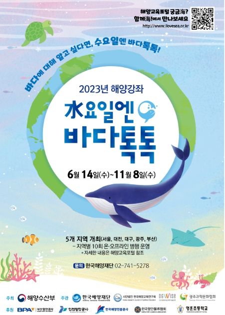 [제주교통복지신문 김강석 기자] 해양수산부와 한국해양재단(이사장 문해남)은 6월 14일부터 전국 5개 도시(서울, 대전, 부산, 대구, 광주)에서 ‘2023년 해양강좌(수요일엔 바다톡톡)’를 동시에 진행한다.