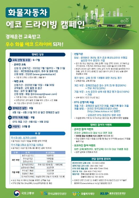 올해 처음 열리는 에코 드라이빙 캠페인(국토교통부 주최, 한국교통안전공단 주관)은 교육을 통해 경제운전 실천을 유도함으로써 연료비를 절감하고 나아가 온실가스 배출량을 감축하여 친환경 물류활동에 기여하고자 마련됐다.