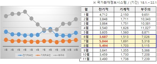 또한 화재원인은 전기적요인으로 인한 화재가 평월보다 40% 가량 증가했는데, 이는 여름철 냉방기기 사용 증가에 따른 것으로 보인다.