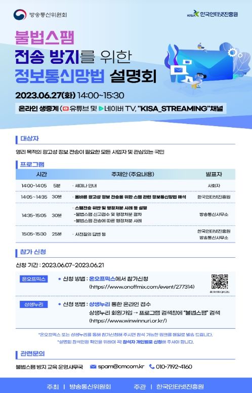 아울러 방통위는 KISA와 함께 오는 6월 27일 사업자와 국민을 대상으로 ‘정보통신망법 온라인 설명회’를 개최하여 정보통신망법의 알기 쉬운 해설과 각종 불법스팸 전송사례 및 처벌규정에 대한 설명 등 관련 법령에 대한 이해도를 높일 계획이다.