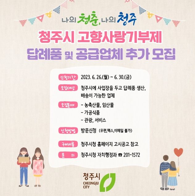 [제주교통복지신문 김강석 기자] 청주시는 고향사랑기부자에게 다양하고 특색 있는 답례품을 제공하기 위해 답례품 및 공급업체를 추가 모집한다고 14일 밝혔다.