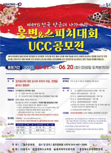 [제주교통복지신문 김강석 기자] 충주문화원은 6월 호국보훈의 달을 맞아 호국 안보의식과 나라사랑 정신을 널리 알리기 위한 ‘제49회 전국 탄금대 나라사랑 웅변·스피치 UCC 공모전’을 개최한다.