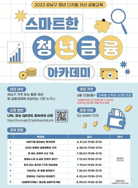조성명 강남구청장은 “이번 청년 맞춤형 금융교육이 디지털 자산 등 재테크 전반에 대한 이해를 높이고 올바른 금융 지식을 확립하는 데 도움이 되길 바란다”며 “앞으로도 청년의 생활 안정을 위한 다각적 지원을 이어가겠다”고 말했다.