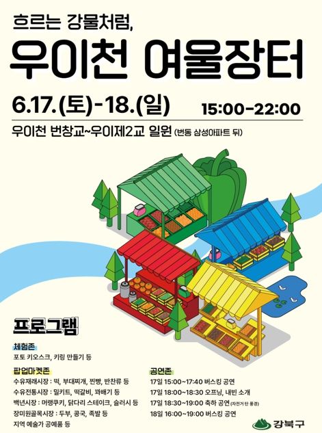 [제주교통복지신문 김강석 기자] 서울 강북구는 전통시장 및 지역상권 활성화 사업의 일환으로 오는 17(토)~18(일)일 우이천 번창교 일대에서 ‘우이천 여울장터’를 개최한다고 밝혔다.